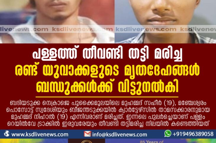 കാസർഗോഡ് പള്ളത്ത് തീവണ്ടി തട്ടി മരിച്ച രണ്ട് യുവാക്കളുടെ മൃതദേഹങ്ങള് ബന്ധുക്കള്ക്ക് വിട്ടുനല്കിJanuary 31, 2024