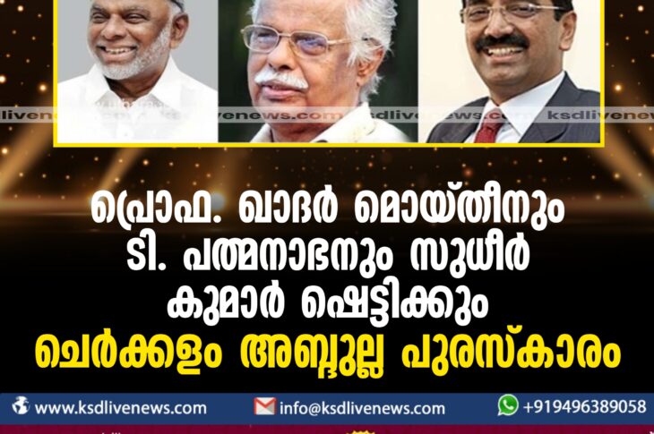 കാസർഗോഡ് പ്രൊഫ.ഖാദര് മൊയ്തീനും ടി.പത്മനാഭനും സുധീര് കുമാര് ഷെട്ടിക്കും ചെര്ക്കളം അബ്ദുല്ല പുരസ്കാരംJanuary 23, 2024