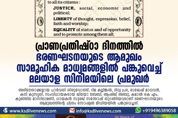 കേരളം പ്രാണപ്രതിഷ്ഠാ ദിനത്തില് ഭരണഘടനയുടെ ആമുഖം സാമൂഹിക മാധ്യമങ്ങളില് പങ്കുവെച്ച് മലയാള സിനിമയിലെ പ്രമുഖര്January 22, 2024