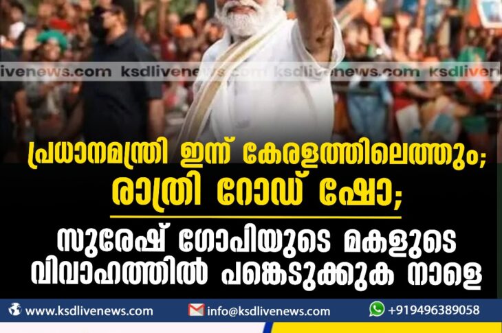 കേരളം പ്രധാനമന്ത്രി ഇന്ന് കേരളത്തിലെത്തും, രാത്രി റോഡ് ഷോ; സുരേഷ് ഗോപിയുടെ മകളുടെ വിവാഹത്തില് പങ്കെടുക്കുക നാളെJanuary 16, 2024