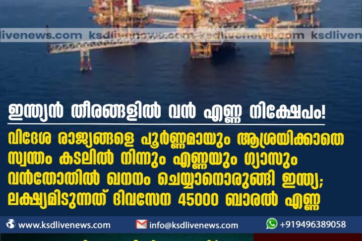 വിദേശം ഇന്ത്യൻ തീരങ്ങളില് വൻ എണ്ണനിക്ഷേപം ! വിദേശരാജ്യങ്ങളെ പൂര്ണ്ണമായും ആശ്രയിക്കാതെ സ്വന്തം കടലില് നിന്നും എണ്ണയും ഗ്യാസും വൻതോതില് ഖനനം ചെയ്യാനൊരുങ്ങി ഇന്ത്യ; ലക്ഷ്യമിടുന്നത് ദിവസേന 45000 ബാരല് എണ്ണJanuary 15, 2024