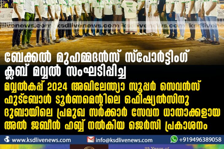 പ്രാദേശികം ബേക്കൽ മുഹമ്മദൻസ് സ്പോർട്ടിംഗ് ക്ലബ് മവ്വൽ സംഘടിപ്പിച്ച മവ്വൽകപ്പ് 2024 അഖിലേന്ത്യാ സൂപ്പർ സെവൻസ് ഫുട്ബോൾ ടൂർണമെന്റിലെ ഒഫിഷ്യൽസിനു ദുബായിലെ പ്രമുഖ സർക്കാർ സേവന ധാതാക്കളായ അൽ ജബീൻ ഹബ്ബ് നൽകിയ ജെർസി പ്രകാശനം.January 12, 2024