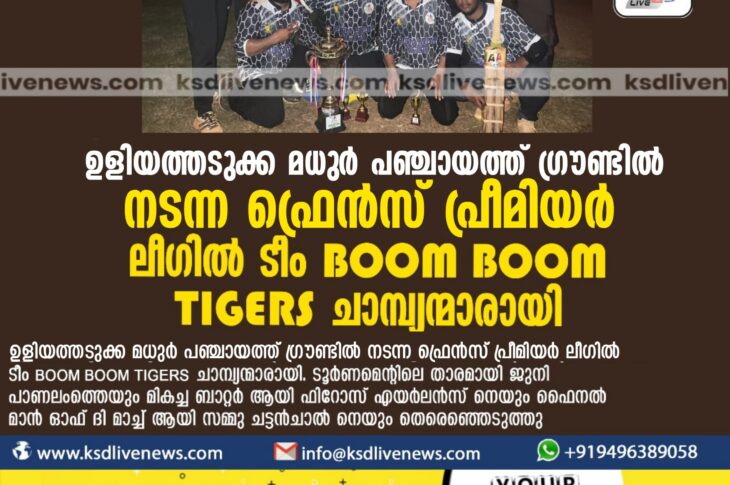 പ്രാദേശികം ഉളിയത്തടുക്ക മധുർ പഞ്ചായത്ത് ഗ്രൗണ്ടിൽ നടന്ന ഫ്രെൻസ് പ്രീമിയർ ലീഗിൽ ടീം BOOM BOOM TIGERS ചാമ്പ്യന്മാരായിJanuary 11, 2024