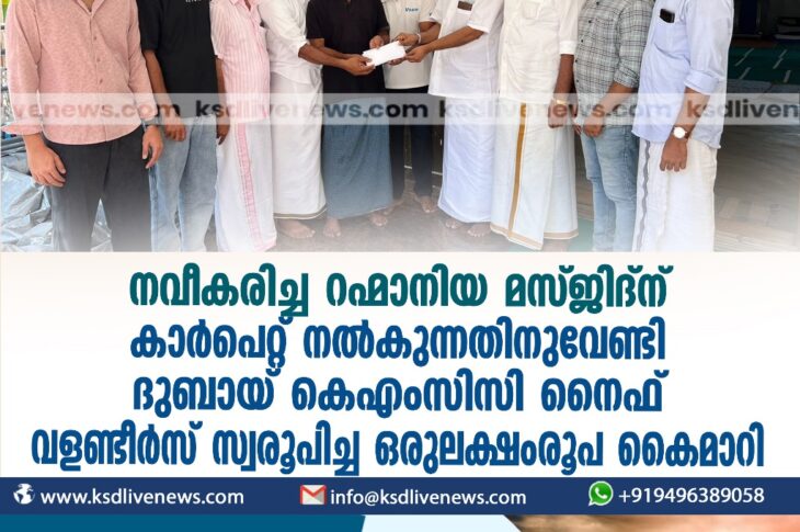 ഗൾഫ് നവീകരിച്ച റഹ്മാനിയ മസ്ജിദ്ന് കാർപെറ്റ് നൽകുന്നതിനുവേണ്ടി ദുബായ് കെഎംസിസി നൈഫ് വളണ്ടീർസ് സ്വരൂപിച്ച ഒരുലക്ഷം രൂപ കൈമാറിDecember 28, 2023