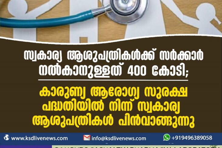 കേരളം സ്വകാര്യ ആശുപത്രികൾക്ക് സർക്കാർ നൽകാനുള്ളത് 400 കോടി; കാരുണ്യ ആരോഗ്യ സുരക്ഷാ പദ്ധതിയില് നിന്ന് സ്വകാര്യ ആശുപത്രികള് പിന്വാങ്ങുന്നുDecember 26, 2023