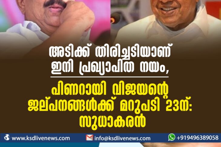 കേരളം അടിക്ക് തിരിച്ചടിയാണ് ഇനി പ്രഖ്യാപിത നയം, പിണറായി വിജയന്റെ ജല്പനങ്ങള്ക്ക് മറുപടി 23ന്- സുധാകരൻDecember 21, 2023