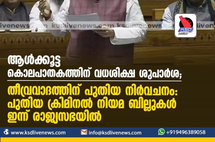 ദേശീയം ആൾക്കൂട്ട കൊലപാതകത്തിന് വധശിക്ഷ ശുപാർശ; തീവ്രവാദത്തിന് പുതിയ നിർവചനം: പുതിയ ക്രിമിനൽ നിയമ ബില്ലുകൾ ഇന്ന് രാജ്യസഭയിൽDecember 21, 2023