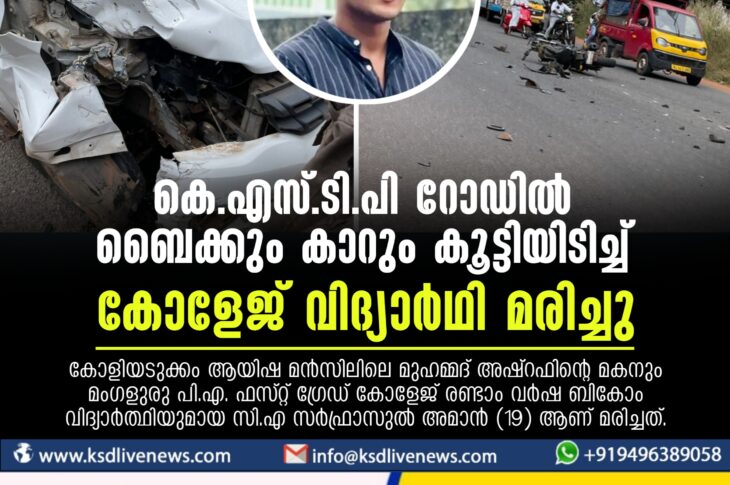 കാസർഗോഡ്പ്രാദേശികം കെ.എസ്.ടി.പി റോഡില് ബൈക്കും കാറും കൂട്ടിയിടിച്ച് കോളേജ് വിദ്യാര്ഥി മരിച്ചുDecember 18, 2023