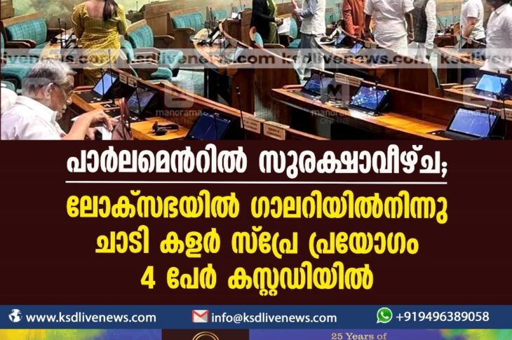 ദേശീയം പാർലമെന്റിൽ സുരക്ഷാവീഴ്ച: ലോക്സഭയിൽ ഗാലറിയിൽനിന്നു ചാടി കളർ സ്പ്രേ പ്രയോഗം, 4 പേർ കസ്റ്റഡിയിൽ- വിഡിയോDecember 13, 2023