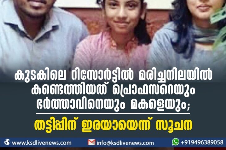 കേരളം കുടകിലെ റിസോർട്ടിൽ മരിച്ചനിലയില് കണ്ടെത്തിയത് പ്രൊഫസറെയും ഭര്ത്താവിനെയും മകളെയും; തട്ടിപ്പിന് ഇരയായെന്ന് സൂചനDecember 11, 2023