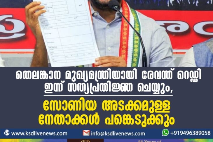 ദേശീയം തെലങ്കാന: രേവന്ത് റെഡ്ഡി ഇന്ന് സത്യപ്രതിജ്ഞ ചെയ്യും, സോണിയ അടക്കമുള്ള നേതാക്കള് പങ്കെടുക്കുംDecember 7, 2023