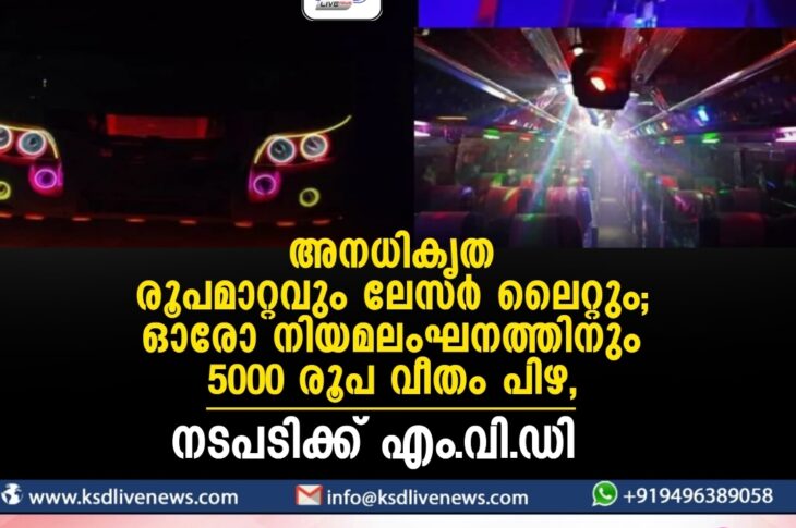 കേരളം അനധികൃത രൂപമാറ്റവും ലേസര് ലൈറ്റും; ഓരോ നിയമലംഘനത്തിനും 5000 രൂപ വീതം പിഴ, നടപടിക്ക് എം.വി.ഡിNovember 28, 2023