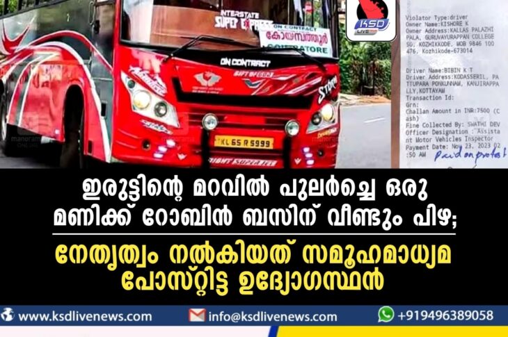 കേരളം ഇരുട്ടിന്റെ മറപറ്റി റോബിൻ ബസിന് വീണ്ടും പിഴ; പരിശോധന ഫെയ്സ്ബുക്ക് പോസ്റ്റിട്ട ഉദ്യോഗസ്ഥന്റെ നേതൃത്വത്തിൽNovember 23, 2023