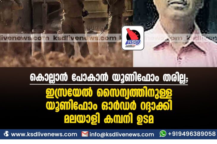 കേരളം കൊല്ലാൻ പോകാൻ യൂണിഫോം തരില്ല’; ഇസ്രയേൽ സൈന്യത്തിനുള്ള യൂണിഫോം ഓർഡർ റദ്ദാക്കി മലയാളി കമ്പനി ഉടമOctober 20, 2023