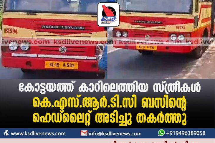 കേരളം കോട്ടയത്ത് കാറിലെത്തിയ സ്ത്രീകള് കെ.എസ്.ആര്.ടി.സി ബസിന്റെ ഹെഡ്ലൈറ്റ് അടിച്ചുതകര്ത്തുNovember 21, 2023