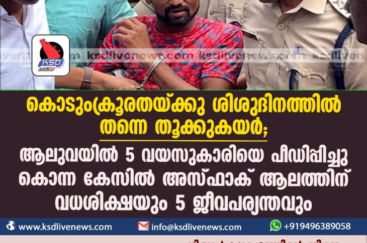 കേരളം കൊടുംക്രൂരതയ്ക്കു ശിശു ദിനത്തിൽ തന്നെ തൂക്കുകയര്; ആലുവയില് 5 വയസുകാരിയെ പീഡിപ്പിച്ചു കൊന്ന കേസില് അസ്ഫാക്ക് ആലത്തിന് വധശിക്ഷയും 5 ജീവപര്യന്തവുംNovember 14, 2023