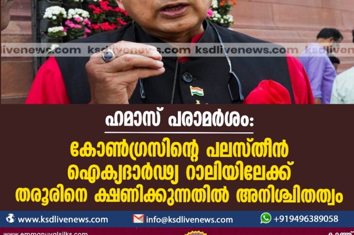 കേരളം ഹമാസ് പരാമർശം: കോണ്ഗ്രസിന്റെ പലസ്തീൻ ഐക്യദാർഢ്യ റാലിയിലേക്ക് തരൂരിനെ ക്ഷണിക്കുന്നതിൽ അനിശ്ചിതത്വംNovember 13, 2023