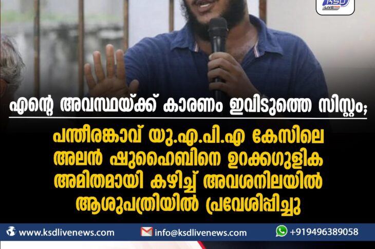കേരളം എന്റെ അവസ്ഥയ്ക്ക് കാരണം ഇവിടുത്തെ സിസ്റ്റം; പന്തീരങ്കാവ് യു.എ.പി.എ കേസിലെ അലൻ ഷുഹൈബിനെ ഉറക്കഗുളിക അമിതമായി കഴിച്ച് അവശനിലയിൽ ആശുപത്രിയില് പ്രവേശിപ്പിച്ചുNovember 8, 2023