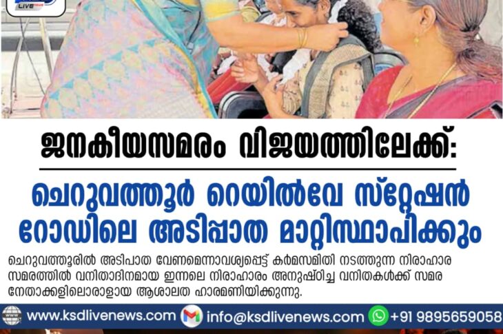 പ്രാദേശികം ജനകീയസമരം വിജയത്തിലേക്ക്; ചെറുവത്തൂർ റെയിൽവേ സ്റ്റേഷൻ റോഡിലെ അടിപ്പാത മാറ്റിസ്ഥാപിക്കുംMarch 9, 2026