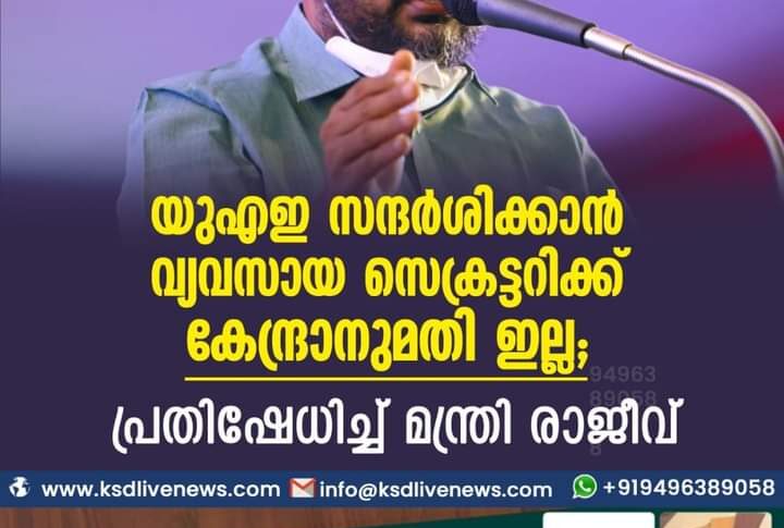 കേരളം യുഎഇ സന്ദർശിക്കാന് വ്യവസായ സെക്രട്ടറിക്ക് കേന്ദ്രാനുമതി ഇല്ല; പ്രതിഷേധിച്ച് മന്ത്രി രാജീവ്November 10, 2021