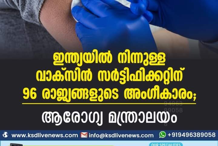 ദേശീയം ഇന്ത്യയില്നിന്നുള്ള വാക്സിന് സര്ട്ടിഫിക്കറ്റിന് 96 രാജ്യങ്ങളുടെ അംഗീകാരം- ആരോഗ്യ മന്ത്രാലയംNovember 10, 2021