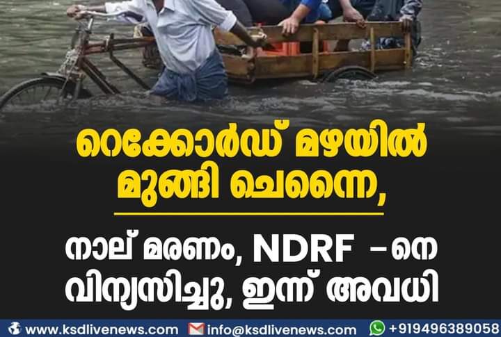 റെക്കോർഡ് മഴയിൽ മുങ്ങി ചെന്നൈ, നാല് മരണം, NDRF-നെ വിന്യസിച്ചു, ഇന്ന് അവധി