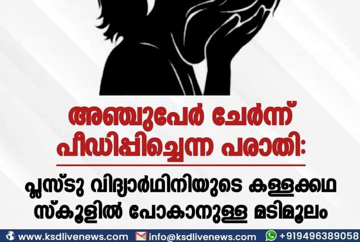 കേരളം അഞ്ചുപേർ ചേർന്ന് പീഡിപ്പിച്ചെന്ന പരാതി: പ്ലസ്ടു വിദ്യാർഥിനിയുടെ കള്ളക്കഥ സ്കൂളിൽ പോകാനുള്ള മടിമൂലംNovember 6, 2021