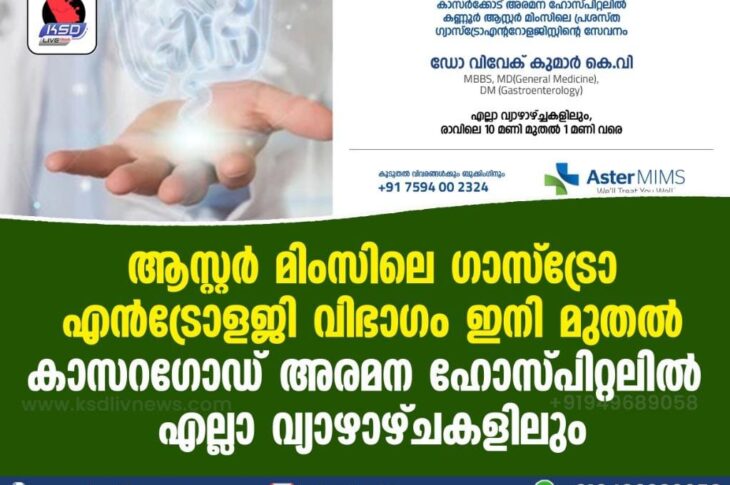 കാസർഗോഡ് ആസ്റ്റർ മിംസിലെ ഗാസ്ട്രോ എൻട്രോളജി വിഭാഗം ഇനി മുതൽ കാസറഗോഡ് അരമന ഹോസ്പിറ്റലിൽ എല്ലാ വ്യാഴാഴ്ചകളിലുംJuly 4, 2021