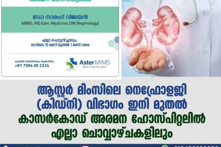 കാസർഗോഡ് ആസ്റ്റർ മിംസ് ലെ നെഫ്രോളജി (കിഡ്നി)വിഭാഗം ഇനി മുതൽ കാസർകോഡ് അരമന ഹോസ്പിറ്റലിൽ എല്ലാ ചൊവ്വാഴ്ചകളിലുംJuly 3, 2021
