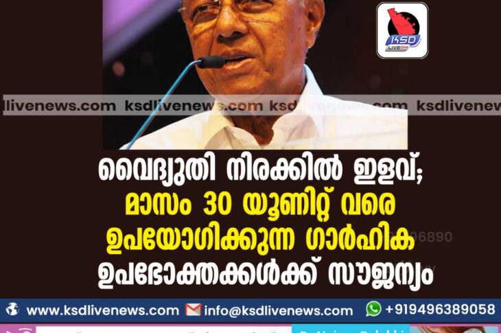 കേരളം വൈദ്യുതി നിരക്കില് ഇളവ്; മാസം 30 യൂണിറ്റ് വരെ ഉപയോഗിക്കുന്ന ഗാര്ഹിക ഉപഭോക്തക്കള്ക്ക് സൗജന്യംJune 29, 2021