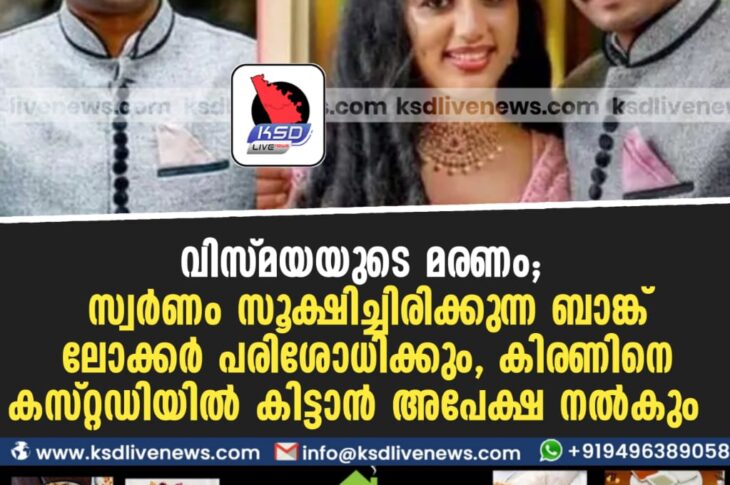 കേരളം വിസ്മയയുടെ മരണം; സ്വര്ണം സൂക്ഷിച്ചിരിക്കുന്ന ബാങ്ക് ലോക്കര് പരിശോധിക്കും, കിരണിനെ കസ്റ്റഡിയില് കിട്ടാന് അപേക്ഷ നല്കുംJune 24, 2021
