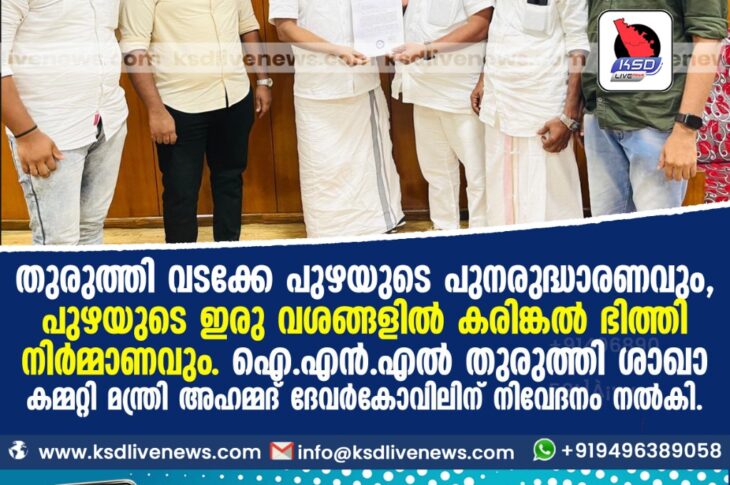 പ്രാദേശികം തുരുത്തി വടക്കേ പുഴയുടെ പുനരുദ്ധാരണവും,പുഴയുടെ ഇരു വശങ്ങളിൽ കരിങ്കൽ ഭിത്തിനിർമ്മാണവും.ഐ.എൻ.എൽതുരുത്തി ശാഖാ കമ്മറ്റി മന്ത്രി അഹമ്മദ് ദേവർകോവിലിന് നിവേദനം നൽകി.June 23, 2021