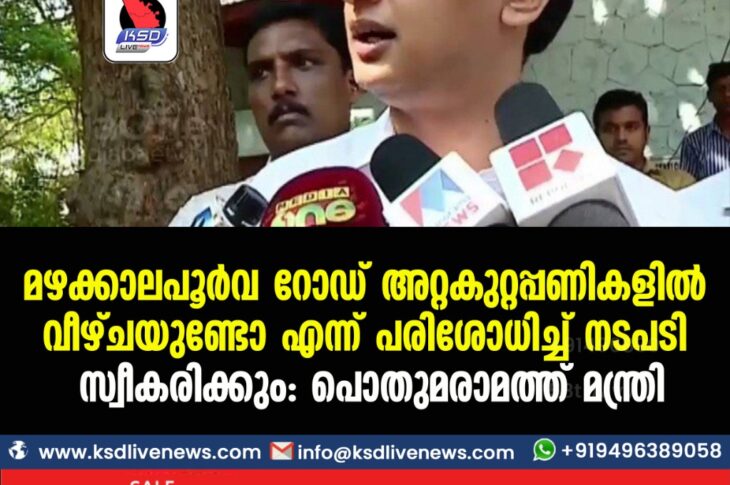 കേരളം മഴക്കാലപൂര്വ റോഡ് അറ്റകുറ്റപ്പണികളില് വീഴ്ചയുണ്ടോ എന്ന് പരിശോധിച്ച് നടപടി സ്വീകരിക്കും: പൊതുമരാമത്ത് മന്ത്രിJune 23, 2021