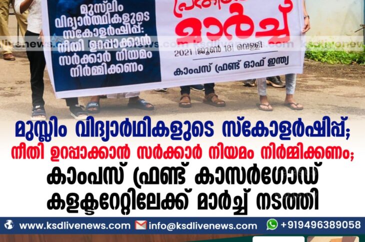 കാസർഗോഡ് മുസ്ലിം വിദ്യാർഥികളുടെ സ്കോളർഷിപ്പ്: നീതി ഉറപ്പാക്കാൻ സർക്കാർ നിയമം നിർമ്മിക്കണം കാംപസ് ഫ്രണ്ട് കാസർഗോഡ് കളക്ടറേറ്റിലേക്ക് മാർച്ച് നടത്തി.June 18, 2021