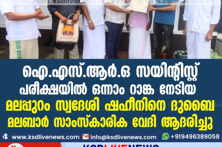 പ്രാദേശികം ഐ.എസ്.ആർ.ഒ സയിന്റിസ്റ്റ് പരീക്ഷയിൽ ഒന്നാം റാങ്ക് നേടിയ മലപ്പുറം സ്വദേശി ഷഹീനിനെ ദുബൈ മലബാർ സാംസ്കാരിക വേദി ആദരിച്ചുJune 10, 2021